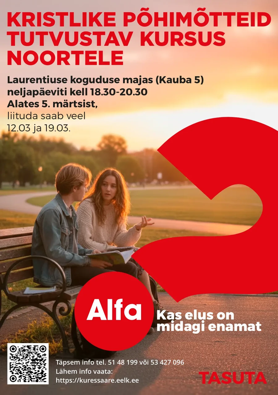 Alfa kursusele on oodatud just need inimesed, kellel on tekkinud usualaseid küsimusi. Kuressaare Laurentiuse koguduses alustame Alfa kursus noortele vanuses kuni 20